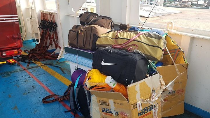 네 명이 가는 무인도캠. 나름 줄인다고 줄인 짐인데도, 참 많다. 가는 곳마다 사람들이 신기하게 봤다. 말을 거는 사람들은 "이사가요?"라고 묻곤 했다.