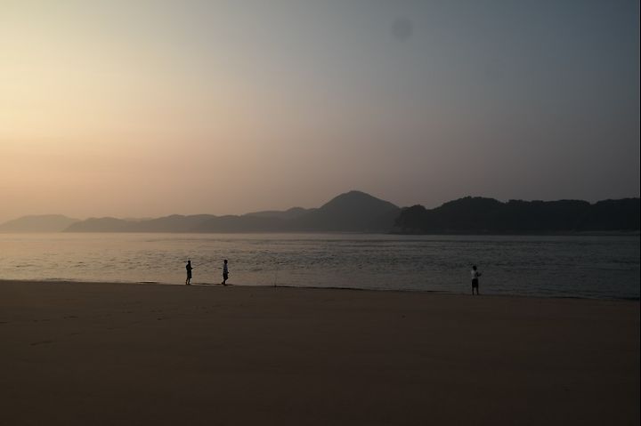 저 멀리 세 사람이 낚시를 한다.